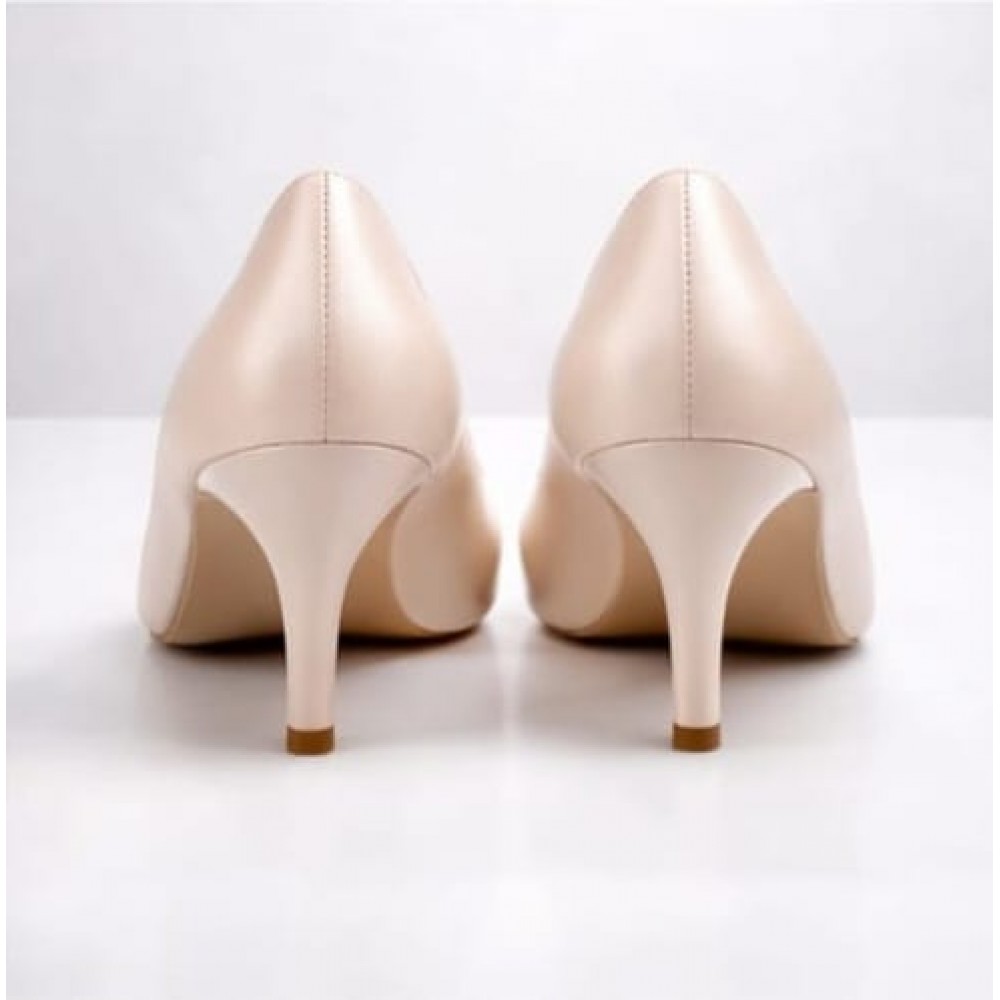 Pantofi stiletto eleganți din piele naturală, în nuanță caldă crem sidef, creați pentru o prezență feminină rafinată și echilibrată. Silueta cu vârf ascuțit alungește optic linia piciorului, iar tocul subțire, de înălțime medie, oferă stabilitate și confort pe parcursul întregii zile.